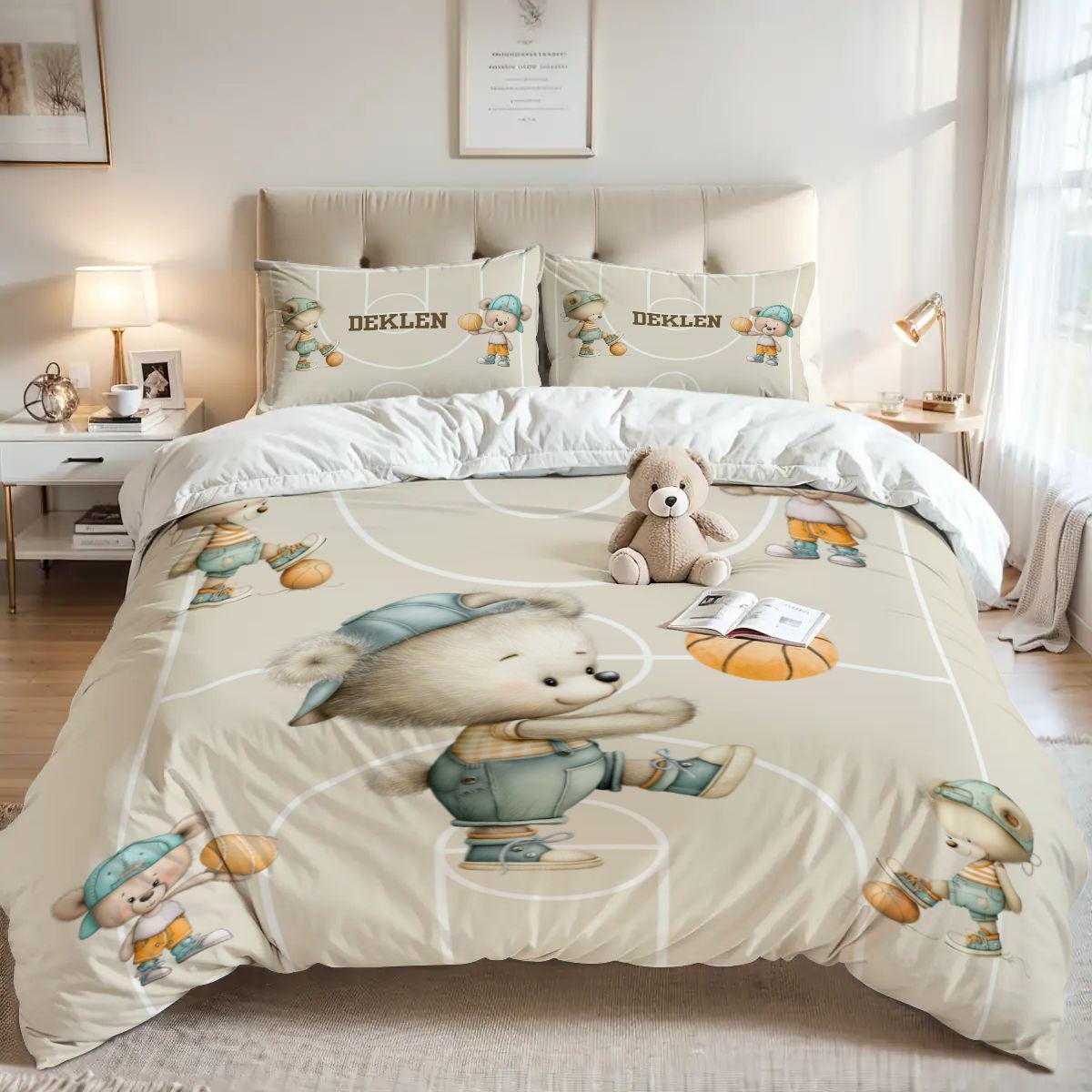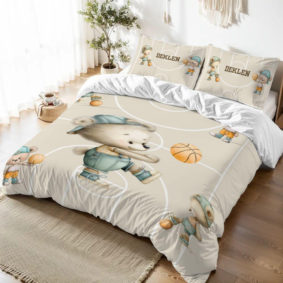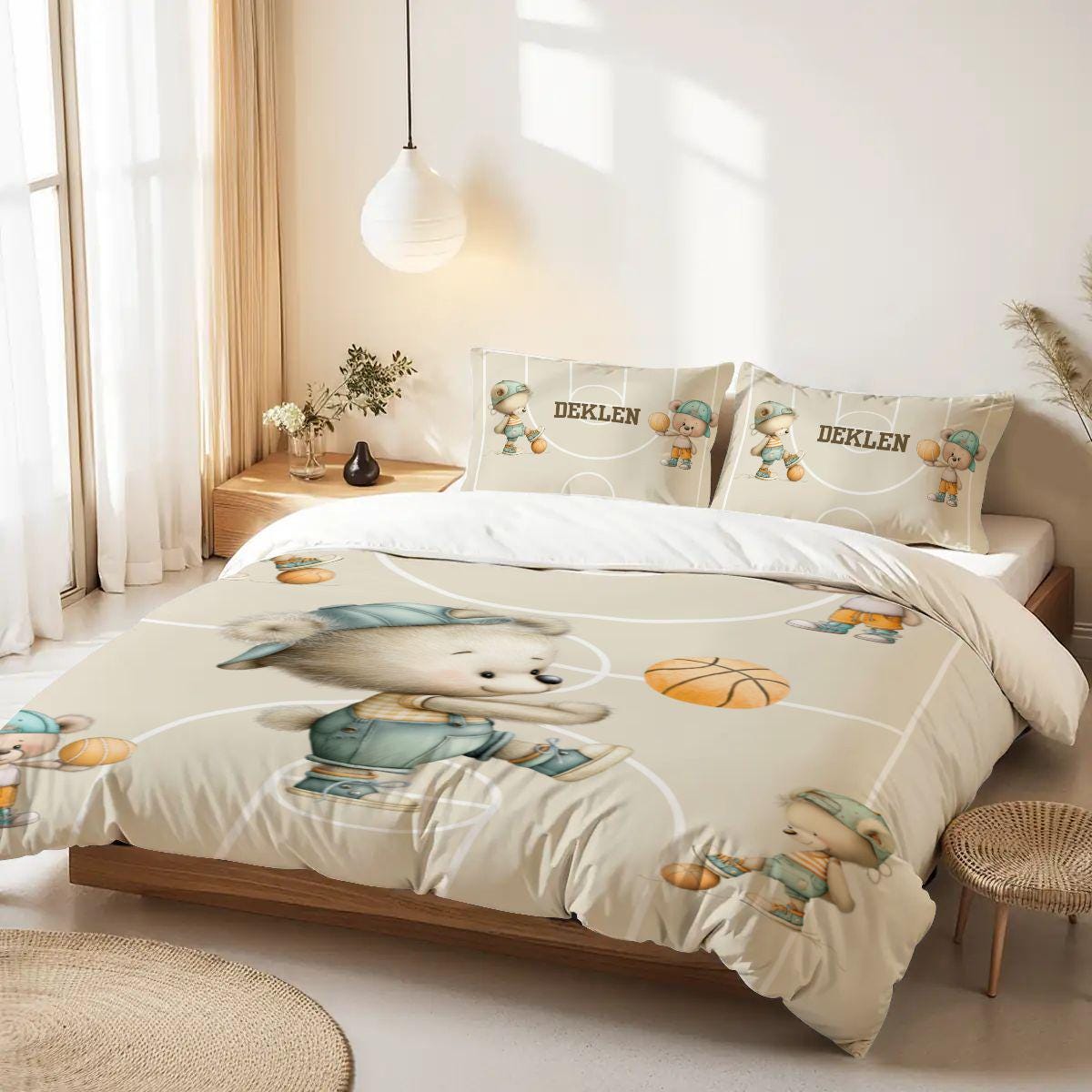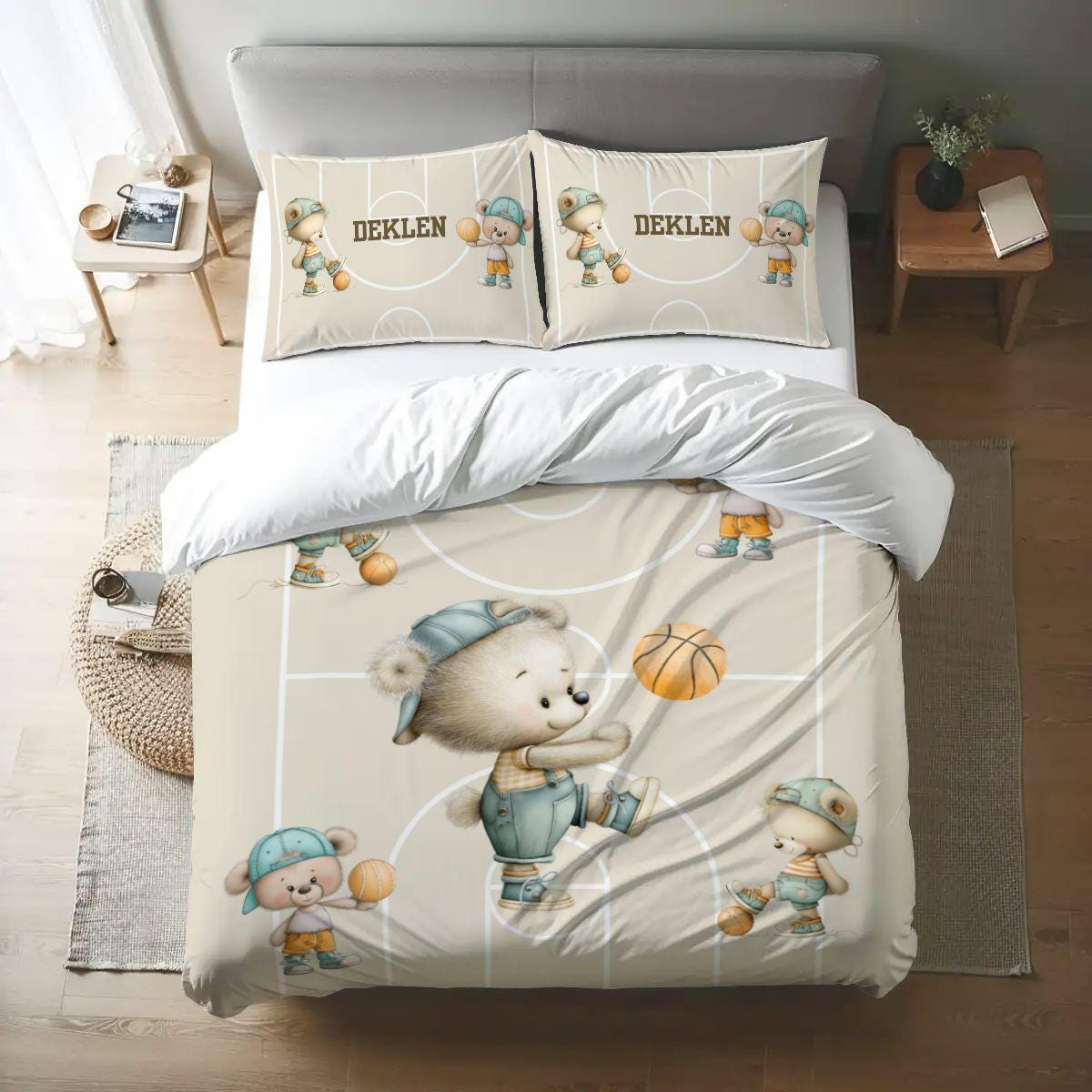 Bear Basketball Bedding Set for Boys – Watercolor Sports Theme Duvet Cover & Pillow Covers, Cute Animal Nursery, Kids Room Decor